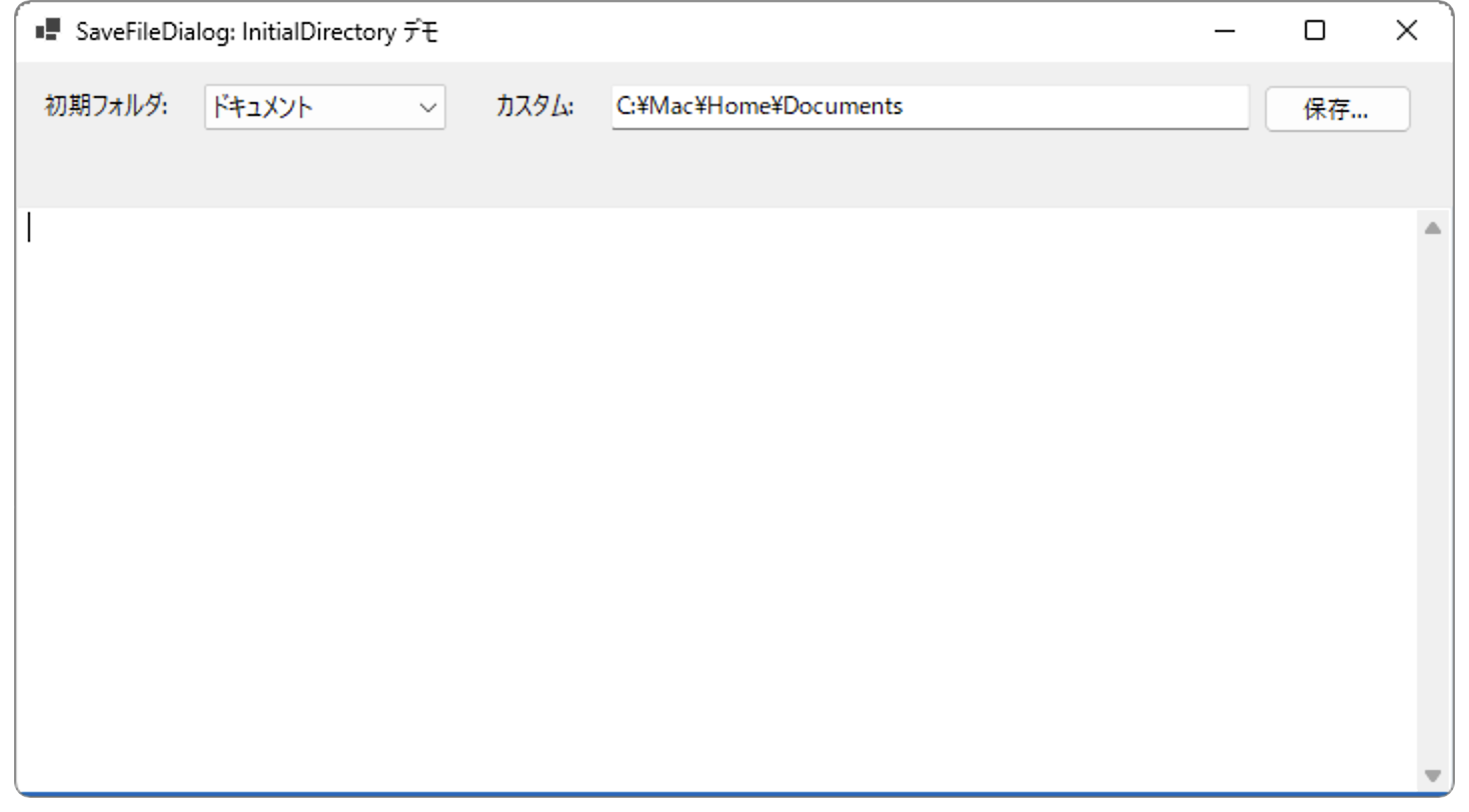 テキストを入力し、「保存…」ボタンで SaveFileDialog を開く最小アプリです。コンボボックスで初期フォルダを選び、InitialDirectory に反映します。フォルダが存在しない場合は自動で安全な場所(ドキュメント)にフォールバックします。