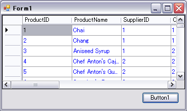 private void Form1_Load(object sender, EventArgs e) { // 1)変数の宣言 System.Data.OleDb.OleDbConnection OleConn = new System.Data.OleDb.OleDbConnection(); System.Data.OleDb.OleDbDataAdapter OleDA; DataSet dtSet = new DataSet("PRODUCTS"); // 2)接続文字列の作成 OleConn.ConnectionString = "Provider=Microsoft.Jet.OLEDB.4.0;" + "Data Source=C:\\Work\\Northwind.mdb;" + "Persist Security Info=False"; // 3)データを取得するためのSQL文を作成する OleDA = new System.Data.OleDb.OleDbDataAdapter("SELECT * FROM PRODUCTS", OleConn); // 4)データセットにデータを取得する OleDA.Fill(dtSet, "PRODUCTS"); // DataGridViewにデータを表示 dataGridView1.DataSource = dtSet.Tables[0]; } private void button1_Click(object sender, EventArgs e) { // フォントの色を変更する dataGridView1.DefaultCellStyle.ForeColor = Color.Blue; }
