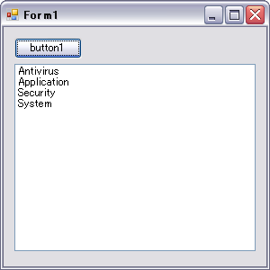 private void button1_Click(object sender, EventArgs e) { //イベントログ配列を取得する System.Diagnostics.EventLog[] evlogs = System.Diagnostics.EventLog.GetEventLogs(); foreach( System.Diagnostics.EventLog log in evlogs ) { //ログ名称を取得し、リストボックスに表示する listBox1.Items.Add(log.Log); } }