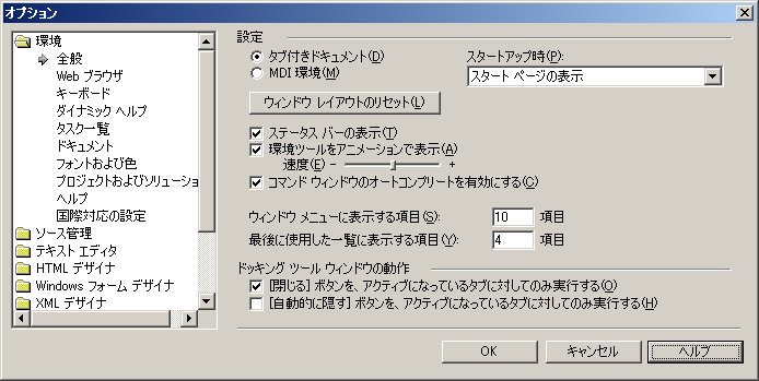 Visual Studio.NETのIDEはツールウィンドウで構成されているので、自由に配置することができます。たまに、配置を間違えたりして元に戻したいのに、うまく戻せない場合があります。[ツール]-[オプション] でオプションウィンドウを表示し、左側で[環境]-[全般]を選択して、右側の[ウィンドウ レイアウトのリセット]ボタンをクリックすると インストール時の配置に戻す事ができます。