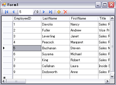 Private Sub Form1_Load(ByVal sender As System.Object, ByVal e As System.EventArgs) Handles MyBase.Load ' BindingNavigator1.BindingSourceプロパティとDataGridView1.DataSourceに ' 同一のBindingSouce1をセットする Me.DataGridView1.DataSource = Me.BindingSource1 Me.BindingNavigator1.BindingSource = Me.BindingSource1 End Sub