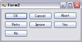 '***** Form1のコード ***** 'Form1 - Button1クリック時の処理 Private Sub Button1_Click(ByVal sender As System.Object, ByVal e As System.EventArgs) Handles Button1.Click Dim frmDialog As New Form2 Dim Result As System.Windows.Forms.DialogResult Result = frmDialog.ShowDialog() MessageBox.Show(Result.ToString() & "が選択されました。") End Sub '***** Form2のコード ***** 'Form2ロード時の処理(各ボタンに親フォームに返す値を設定) Private Sub Form2_Load(ByVal sender As System.Object, ByVal e As System.EventArgs) Handles MyBase.Load Button1.DialogResult = Windows.Forms.DialogResult.OK Button2.DialogResult = Windows.Forms.DialogResult.Cancel Button3.DialogResult = Windows.Forms.DialogResult.Abort Button4.DialogResult = Windows.Forms.DialogResult.Retry Button5.DialogResult = Windows.Forms.DialogResult.Ignore Button6.DialogResult = Windows.Forms.DialogResult.Yes Button7.DialogResult = Windows.Forms.DialogResult.No End Sub