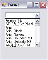 Private Sub Form1_Load(ByVal sender As System.Object, ByVal e As System.EventArgs) Handles MyBase.Load 'InstalledFontCollectionオブジェクトの取得 Dim InstalledFont As New System.Drawing.Text.InstalledFontCollection 'インストール済みフォントを取得してコンボボックスに表示する Dim FontFamilies As FontFamily() = InstalledFont.Families For Each f As FontFamily In FontFamilies ComboBox1.Items.Add(f.Name) Next f End Sub