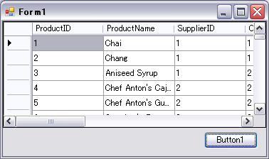 Private Sub Form1_Load(ByVal sender As System.Object, ByVal e As System.EventArgs) Handles MyBase.Load '1)変数の宣言 Dim OleConn As OleDb.OleDbConnection = New OleDb.OleDbConnection Dim OleDA As OleDb.OleDbDataAdapter Dim dtSet As DataSet = New DataSet("PRODUCTS") '2)接続文字列の作成 OleConn.ConnectionString = _ "Provider=Microsoft.Jet.OLEDB.4.0;" & _ "Data Source=C:\Work\Northwind.mdb;" & _ "Persist Security Info=False" '3)データを取得するためのSQL文を作成する OleDA = New OleDb.OleDbDataAdapter("SELECT * FROM Products", OleConn) '4)データセットにデータを取得する OleDA.Fill(dtSet, "PRODUCTS") 'DataGridViewに表示 DataGridView1.DataSource = dtSet.Tables(0) End Sub Private Sub Button1_Click(ByVal sender As System.Object, ByVal e As System.EventArgs) Handles Button1.Click 'ProductID列が常にDataGridViewに表示されるようにする Me.DataGridView1.Columns("ProductID").Frozen = True End Sub