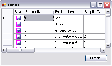 Private Sub Form1_Load(ByVal sender As System.Object, ByVal e As System.EventArgs) Handles MyBase.Load '1)変数の宣言 Dim OleConn As OleDb.OleDbConnection = New OleDb.OleDbConnection Dim OleDA As OleDb.OleDbDataAdapter Dim dtSet As DataSet = New DataSet("PRODUCTS") '2)接続文字列の作成 OleConn.ConnectionString = _ "Provider=Microsoft.Jet.OLEDB.4.0;" & _ "Data Source=C:\Work\Northwind.mdb;" & _ "Persist Security Info=False" '3)データを取得するためのSQL文を作成する OleDA = New OleDb.OleDbDataAdapter("SELECT * FROM Products", OleConn) '4)データセットにデータを取得する OleDA.Fill(dtSet, "PRODUCTS") 'DataGridViewに表示 DataGridView1.DataSource = dtSet.Tables(0) End Sub Private Sub Button1_Click(ByVal sender As System.Object, ByVal e As System.EventArgs) Handles Button1.Click Dim imageColumn As New DataGridViewImageColumn() With imageColumn .Image = Bitmap.FromFile("C:\Work\Save.bmp") 'ファイルからイメージを読み込み .Name = "Save" .HeaderText = "Save" End With DataGridView1.Columns.Insert(0, imageColumn) End Sub