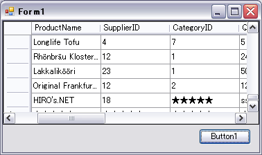 Private Sub Form1_Load(ByVal sender As System.Object, ByVal e As System.EventArgs) Handles MyBase.Load '1)変数の宣言 Dim OleConn As OleDb.OleDbConnection = New OleDb.OleDbConnection Dim OleDA As OleDb.OleDbDataAdapter Dim dtSet As DataSet = New DataSet("PRODUCTS") '2)接続文字列の作成 OleConn.ConnectionString = _ "Provider=Microsoft.Jet.OLEDB.4.0;" & _ "Data Source=C:\Work\Northwind.mdb;" & _ "Persist Security Info=False" '3)データを取得するためのSQL文を作成する OleDA = New OleDb.OleDbDataAdapter("SELECT * FROM Products", OleConn) '4)データセットにデータを取得する OleDA.Fill(dtSet, "PRODUCTS") 'DataGridViewに表示 DataGridView1.DataSource = dtSet.Tables(0) End Sub Private Sub Button1_Click(ByVal sender As System.Object, ByVal e As System.EventArgs) Handles Button1.Click 'セル値がNULLの場合 ★★★★★ を表示する DataGridView1.DefaultCellStyle.NullValue = "★★★★★" End Sub