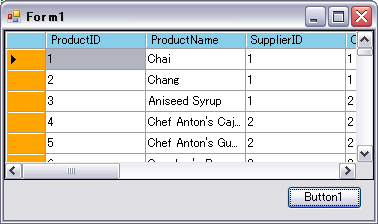 Private Sub Form1_Load(ByVal sender As System.Object, ByVal e As System.EventArgs) Handles MyBase.Load '1)変数の宣言 Dim OleConn As OleDb.OleDbConnection = New OleDb.OleDbConnection Dim OleDA As OleDb.OleDbDataAdapter Dim dtSet As DataSet = New DataSet("PRODUCTS") '2)接続文字列の作成 OleConn.ConnectionString = _ "Provider=Microsoft.Jet.OLEDB.4.0;" & _ "Data Source=C:\Work\Northwind.mdb;" & _ "Persist Security Info=False" '3)データを取得するためのSQL文を作成する OleDA = New OleDb.OleDbDataAdapter("SELECT * FROM Products", OleConn) '4)データセットにデータを取得する OleDA.Fill(dtSet, "PRODUCTS") 'DataGridViewに表示 DataGridView1.DataSource = dtSet.Tables(0) End Sub Private Sub Button1_Click(ByVal sender As System.Object, ByVal e As System.EventArgs) Handles Button1.Click 'VisualStyleを無効にして、列ヘッダーと行ヘッダーの色を指定する DataGridView1.EnableHeadersVisualStyles = False DataGridView1.ColumnHeadersDefaultCellStyle.BackColor = Color.SkyBlue DataGridView1.RowHeadersDefaultCellStyle.BackColor = Color.Orange End Sub