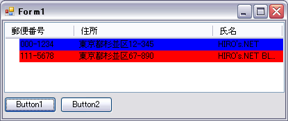 Private Sub Form1_Load(ByVal sender As System.Object, ByVal e As System.EventArgs) Handles MyBase.Load '詳細表示にする ListView1.View = View.Details 'ヘッダーを追加する(ヘッダー名、幅、アライメント) ListView1.Columns.Add("郵便番号", 100, HorizontalAlignment.Left) ListView1.Columns.Add("住所", 200, HorizontalAlignment.Left) ListView1.Columns.Add("氏名", 100, HorizontalAlignment.Left) Dim itemx1 As New ListViewItem Dim itemx2 As New ListViewItem 'アイテムの作成 itemx1.Text = "000-1234" 'アイテムの追加 itemx1.SubItems.Add("東京都杉並区12-345") 'サブアイテムの追加 itemx1.SubItems.Add("HIRO's.NET") 'サブアイテムの追加 itemx2.Text = "111-5678" 'アイテムの追加 itemx2.SubItems.Add("東京都杉並区67-890") 'サブアイテムの追加 itemx2.SubItems.Add("HIRO's.NET BLOG") 'サブアイテムの追加 'アイテムをリスビューに追加する ListView1.Items.Add(itemx1) ListView1.Items.Add(itemx2) End Sub Private Sub Button1_Click(ByVal sender As System.Object, ByVal e As System.EventArgs) Handles Button1.Click '1行目を青にする ListView1.Items(0).BackColor = Color.Blue '2行目を赤にする ListView1.Items(1).BackColor = Color.Red End Sub