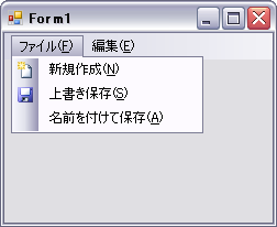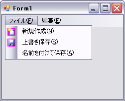 Private Sub Form1_Load(ByVal sender As System.Object, ByVal e As System.EventArgs) Handles MyBase.Load 'メニュー項目の作成 Dim menuFile As New ToolStripMenuItem menuFile.Text = "ファイル(&F)" Dim menuFileNew As New ToolStripMenuItem menuFileNew.Text = "新規作成(&N)" menuFileNew.Image = Image.FromFile("C:\Work\NewDocument.bmp") menuFileNew.ImageTransparentColor = Color.Fuchsia '「新規作成」を「ファイル」へ追加 menuFile.DropDownItems.Add(menuFileNew) Dim menuFileSave As New ToolStripMenuItem menuFileSave.Text = "上書き保存(&S)" menuFileSave.Image = Image.FromFile("C:\Work\Save.bmp") menuFileSave.ImageTransparentColor = Color.Fuchsia '「上書き保存」を「ファイル」へ追加 menuFile.DropDownItems.Add(menuFileSave) Dim menuFileSaveAs As New ToolStripMenuItem menuFileSaveAs.Text = "名前を付けて保存(&A)" '「名前を付けて保存」を「ファイル」へ追加 menuFile.DropDownItems.Add(menuFileSaveAs) 'メニュー項目の追加 MenuStrip1.Items.Add(menuFile) 'メニュー項目の作成 Dim item2 As New ToolStripMenuItem item2.Text = "編集(&E)" 'メニュー項目の追加 MenuStrip1.Items.Add(item2) End Sub