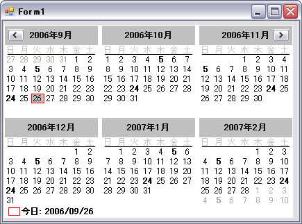 Private Sub Form1_Load(ByVal sender As System.Object, ByVal e As System.EventArgs) Handles MyBase.Load '毎月5,24日を太字にする。 '(年月を指定していますが、MonthlyBoldedDatesでは無視されます) MonthCalendar1.MonthlyBoldedDates = New System.DateTime() { _ New System.DateTime(2006, 1, 5, 0, 0, 0, 0), _ New System.DateTime(2006, 1, 24, 0, 0, 0)} '3列×2列の月を表示する MonthCalendar1.CalendarDimensions = New Size(3, 2) End Sub