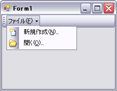 Private Sub Form1_Load(ByVal sender As System.Object, ByVal e As System.EventArgs) Handles MyBase.Load '=== ToolStripDropDownButtonに追加する項目の作成 ここから === Dim item As New ToolStripDropDownButton item.Text = "ファイル(&F)" Dim tsmItem1 As New ToolStripMenuItem tsmItem1.Text = "新規作成(&N)..." '表示するテキスト tsmItem1.Image = New Bitmap("C:\Work\NewDocument.bmp") '表示するイメージ tsmItem1.ImageTransparentColor = Color.Magenta 'イメージの透過色 Dim tsmItem2 As New ToolStripMenuItem tsmItem2.Text = "開く(&O)..." '表示するテキスト tsmItem2.Image = New Bitmap("C:\Work\XPfolder_Open.bmp") '表示するイメージ tsmItem2.ImageTransparentColor = Color.Magenta 'イメージの透過色 item.DropDownItems.Add(tsmItem1) item.DropDownItems.Add(tsmItem2) '=== ToolStripDropDownButtonに追加する項目の作成 ここまで === 'イベントの登録 AddHandler tsmItem1.Click, AddressOf MenuFileNew_Click AddHandler tsmItem2.Click, AddressOf MenuFileOpen_Click 'ToolSripへ追加 ToolStrip1.Items.Add(item) End Sub Private Sub MenuFileNew_Click(ByVal sender As System.Object, ByVal e As System.EventArgs) MessageBox.Show("[新規作成]がクリックされました!!") End Sub Private Sub MenuFileOpen_Click(ByVal sender As System.Object, ByVal e As System.EventArgs) MessageBox.Show("[開く]がクリックされました!!") End Sub